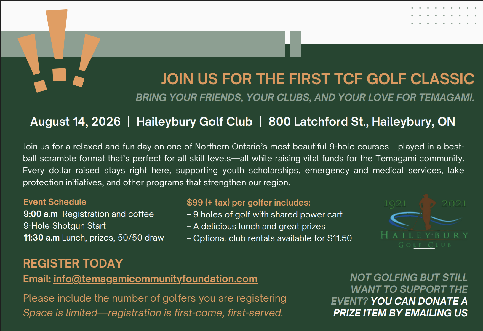 The Temagami Community Foundation’s first Golf Classic will take place on August 14, 2026, at the Haileybury Golf Club. This relaxed and inclusive fundraising event invites golfers of all skill levels to enjoy a 9-hole best-ball scramble on one of Northern Ontario’s most scenic courses. Proceeds from the tournament will directly support scholarships and community granting initiatives that strengthen the Temagami community.